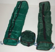 This trap is constructed of shade cloth and has an internal spring and wire frame to maintain shape of the trap when open. It also folds up for easy transport and storage.